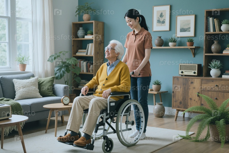 Мужчина с инвалидностью получает помощь от азиатского опекуна дома