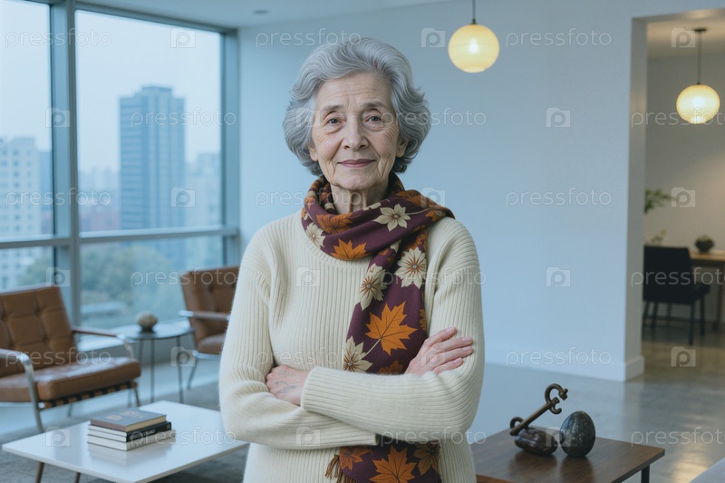 Портрет пожилой женщины, уверенно стоящей в современном офисе