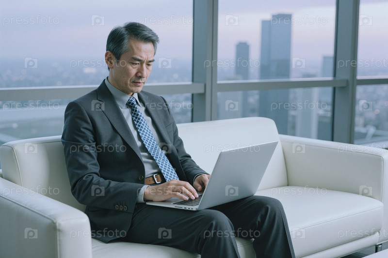 Азиатский бизнесмен средних лет, работающий на ноутбуке в офисной гостиной