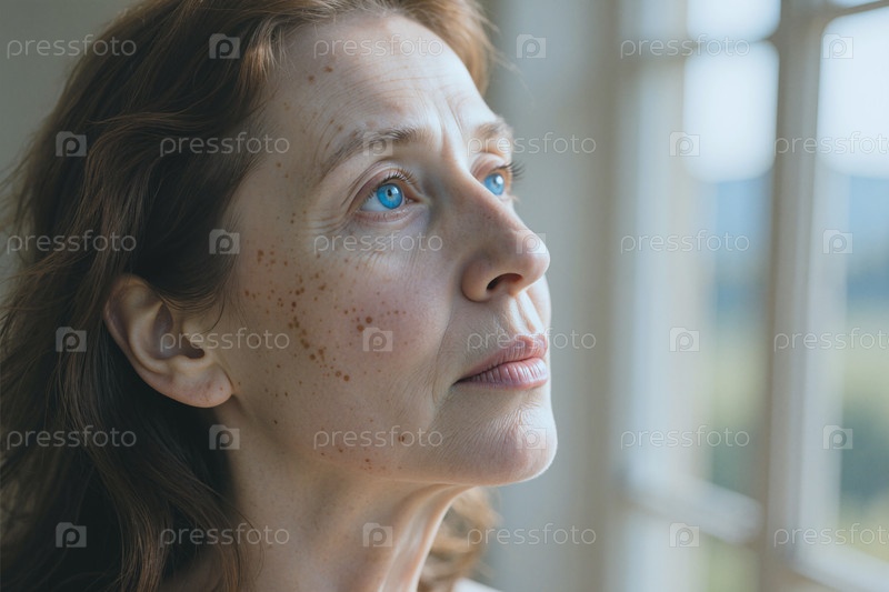 Женщина средних лет смотрит в сторону на рефлексивный портрет благополучия