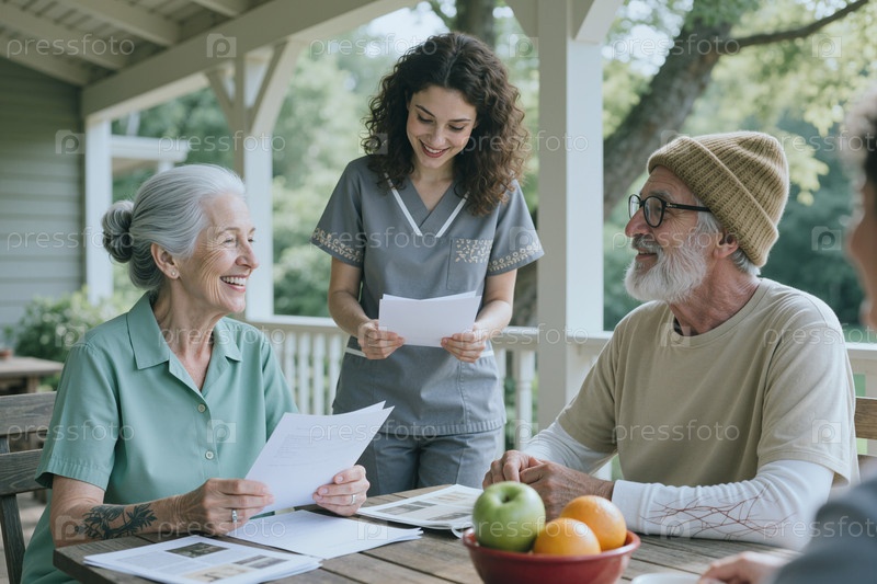 Старшая пара просматривает документы по уходу с медсестрой на открытом воздухе
