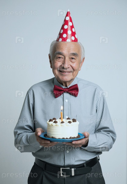Портрет старшего мужчины, держащего пирог на день рождения для празднования маркетинга