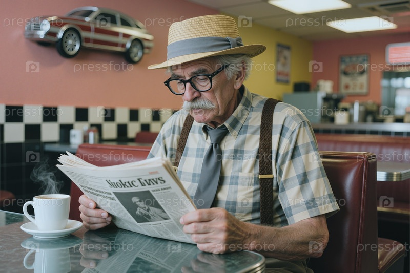 Старший мужчина читает газету в столовой во время утреннего перерыва на кофе