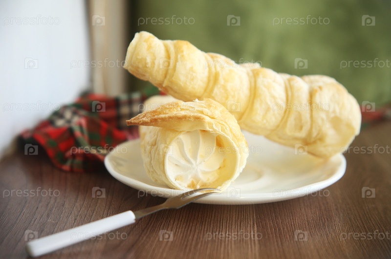 Вкусные пирожные трубочки с белковым кремом на тарелке. Крупный план