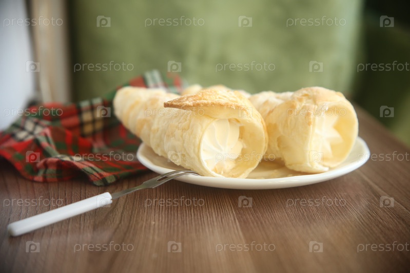 Вкусные пирожные трубочки с белковым кремом на тарелке. Крупный план