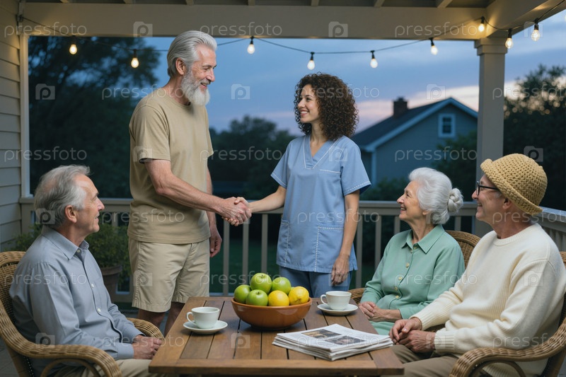 Старший мужчина приветствует опекуна во время посещения дома с оказанием помощи в жизни