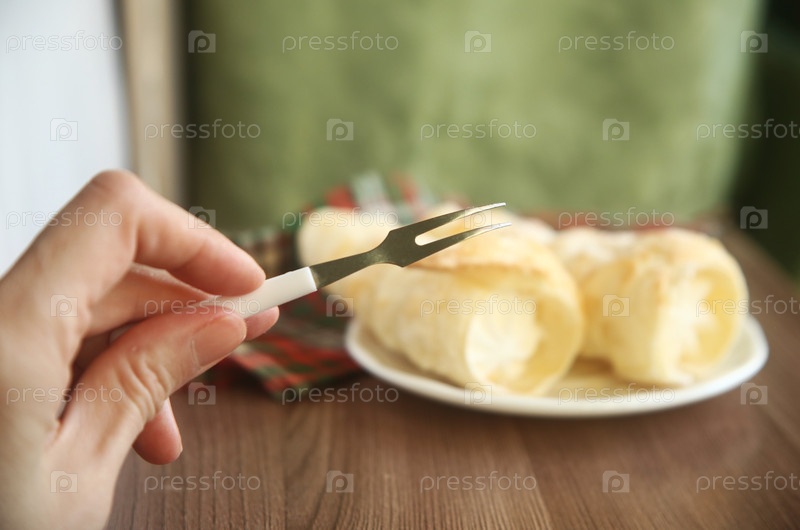 Рука с вилкой на фоне пирожных трубочки с белковым кремом. Крупный план