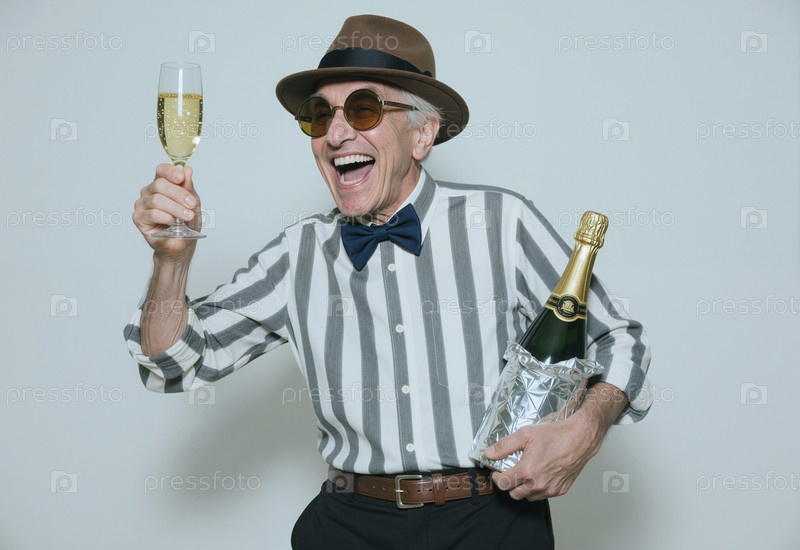 Портрет пожилого человека, празднующего с шампанским для продвижения вечеринки