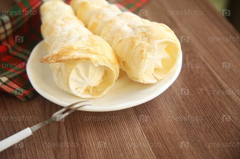 Вкусные пирожные трубочки с белковым кремом на тарелке. Крупный план