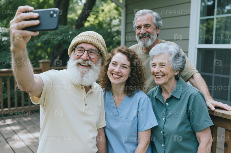 Пожилые люди с взрослым опекуном, берущие смартфон для селфи на улице