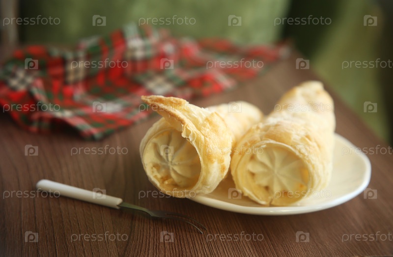 Вкусные пирожные трубочки с белковым кремом на тарелке. Крупный план