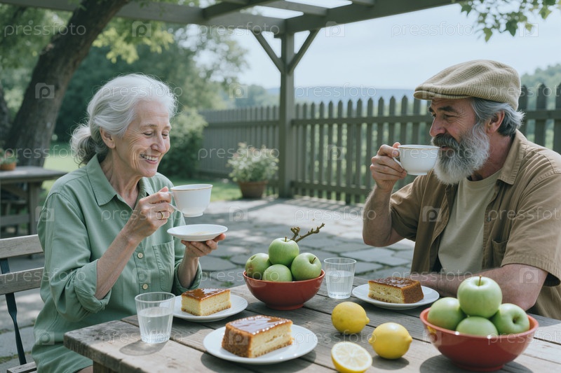 Старшая пара пьет чай на свежем воздухе во время расслабленного отдыха