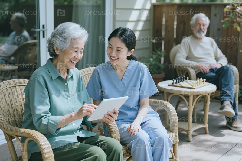Пожилая азиатская женщина использует планшет с опекуном в вспомогательной семье