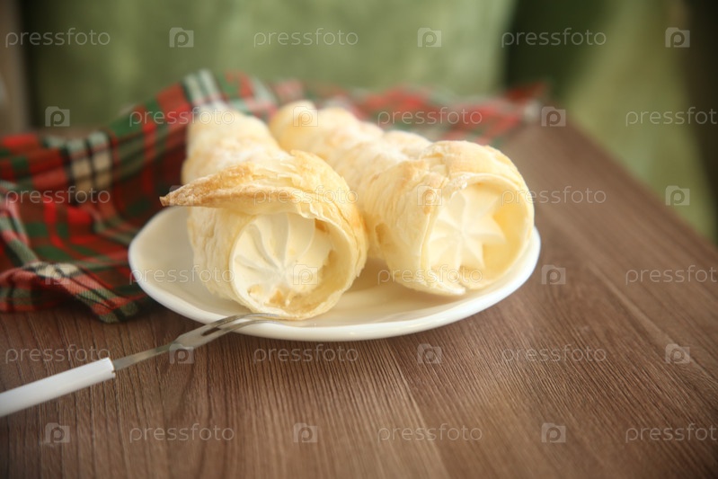 Пирожные трубочки с белковым кремом на тарелке. Крупный план