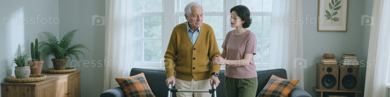 Старший мужчина использует ходунка с взрослой дочерью, поддерживающей дома