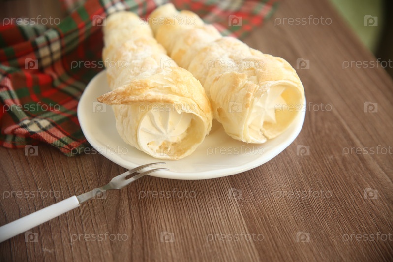 Вкусные пирожные трубочки с белковым кремом на тарелке. Крупный план