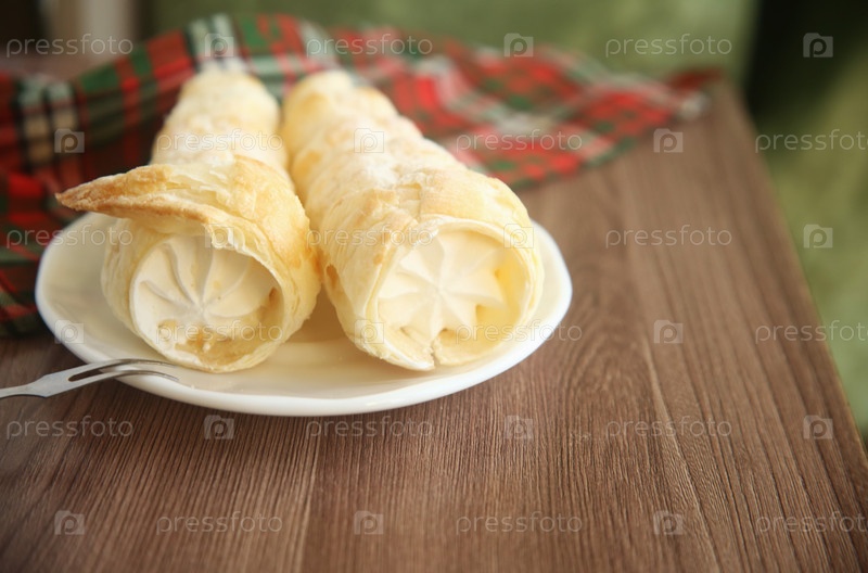 Вкусные пирожные трубочки с белковым кремом на тарелке. Крупный план