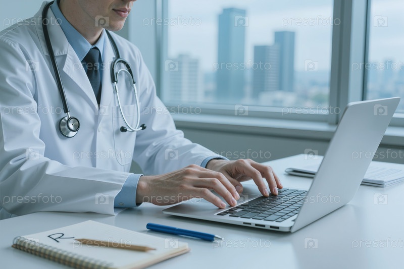Взрослый врач-мужчина печатает на ноутбуке для телемедицинской консультации