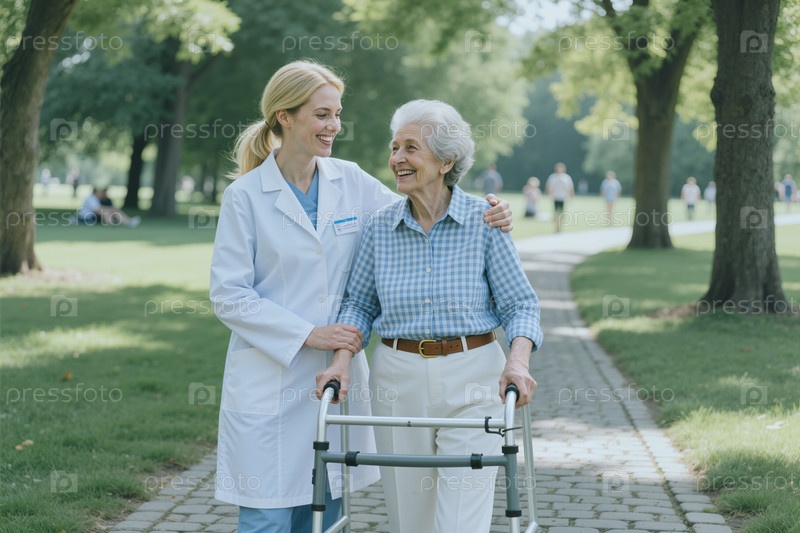 Пожилая женщина гуляет с ходунком, которому помогает опекун в парке