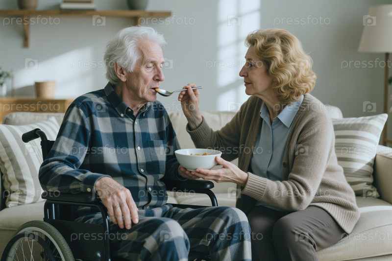 Пожилая женщина, кормящая пожилого человека с инвалидностью во время домашнего ухода