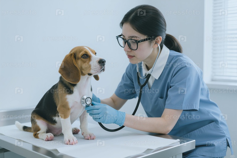 Азиатская женщина-ветеринар, осматривающая собаку бегла в клинике