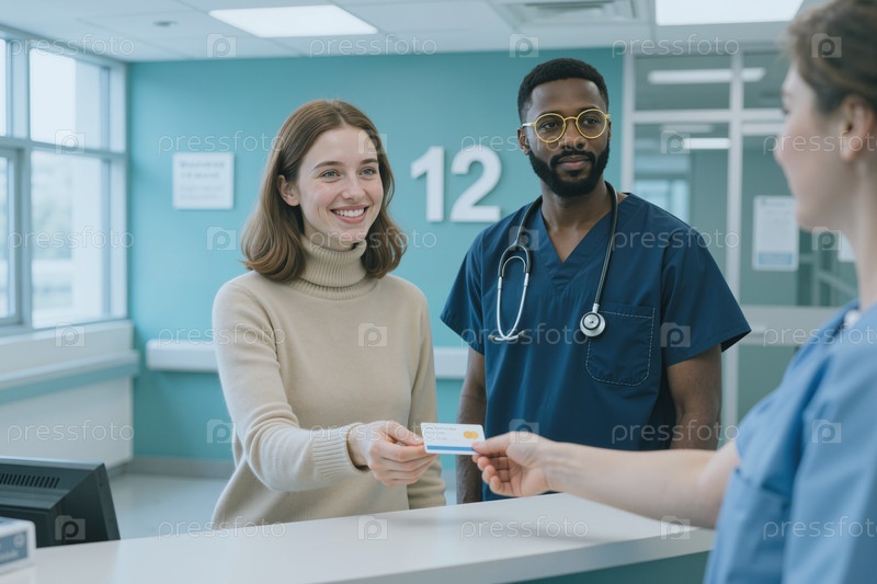 Взрослая женщина, представляющая страховую карту на приемной больницы