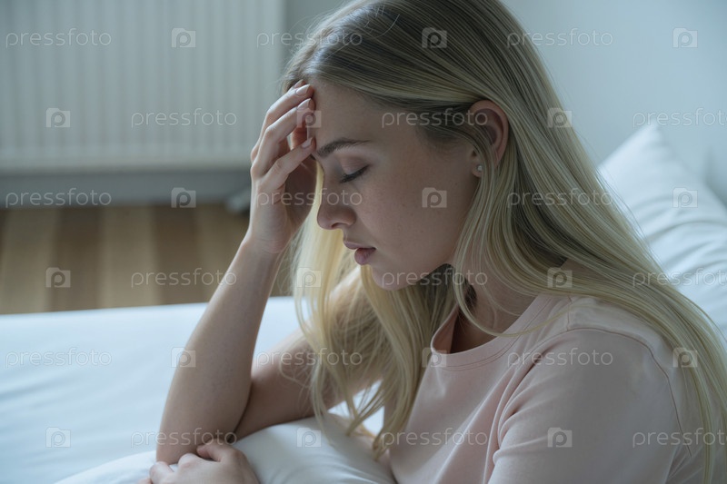 Взрослая женщина, страдающая головной болью дома во время выздоровления от болезни