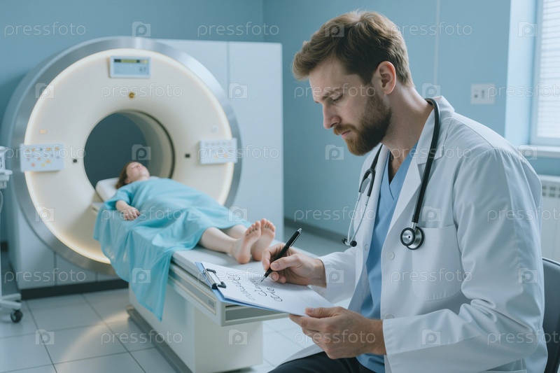 Врач, просматривающий заметки во время детского МРТ-сканирования в больнице Мужчина
