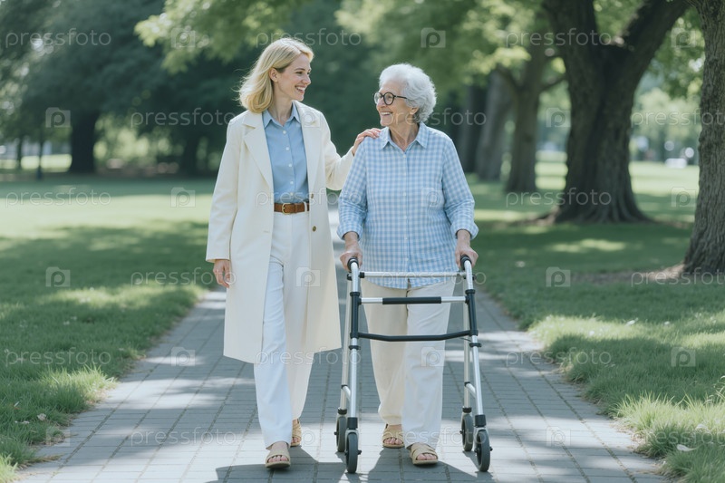 Пожилая женщина ходит на роллере с опекуном в парке