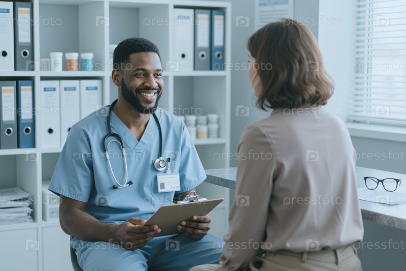 Чёрный мужчина врач консультирует женщину во время медицинской встречи