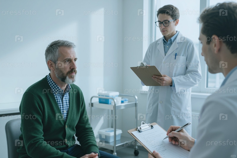 Мужчина средних лет посещает медицинскую консультацию с врачами