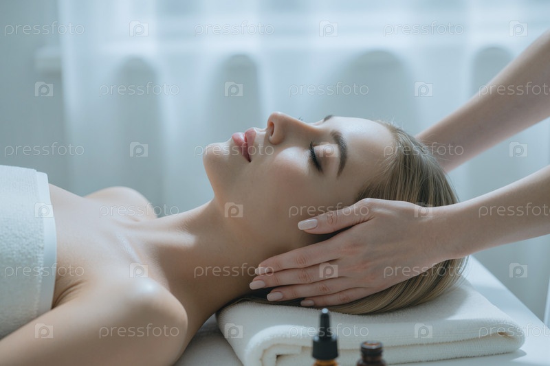 Взрослая женщина получает расслабляющий массаж головы в Wellness Spa