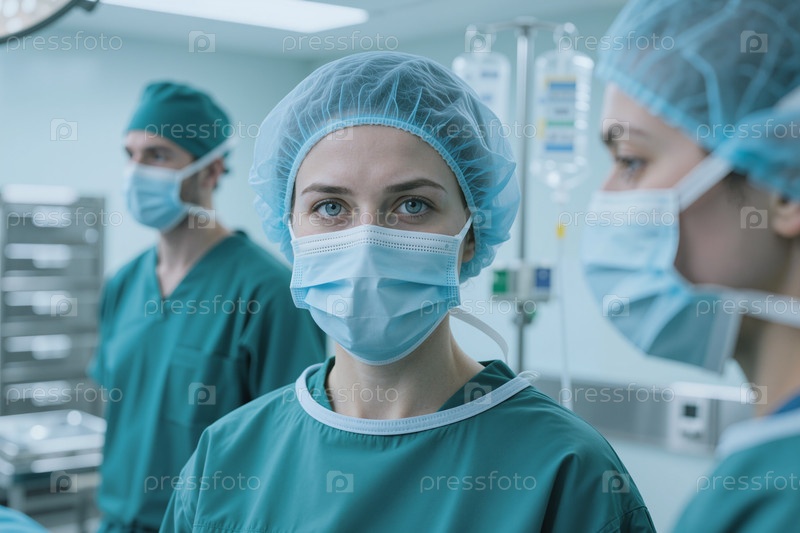 Портрет взрослой женщины-хирурга, стоящей в операционной команде