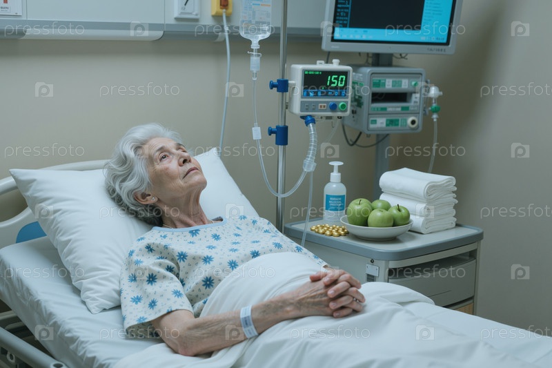 Пожилая женщина отдыхает в больничной постели во время стационарного выздоровления