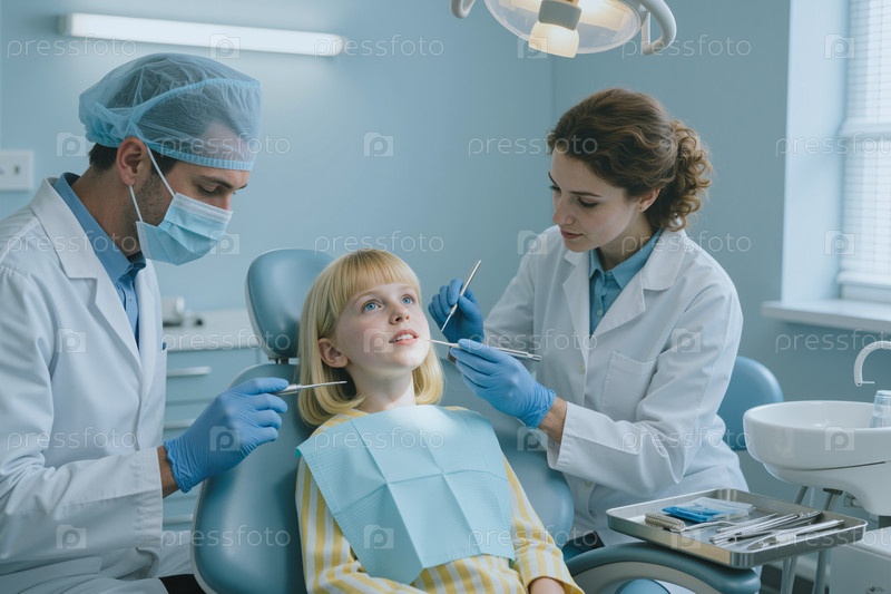Стоматологи, осматривающие детского пациента во время педиатрического стоматологического обследования