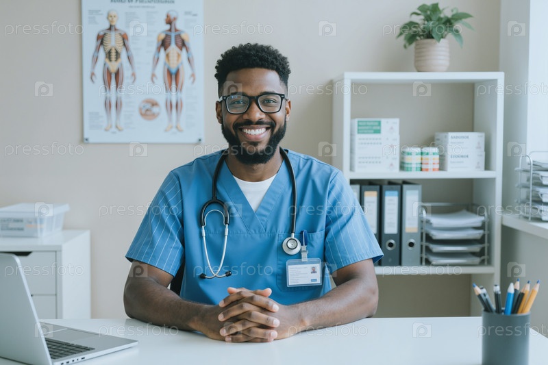 Портрет чернокожего врача-мужчины, улыбающегося в медицинском кабинете