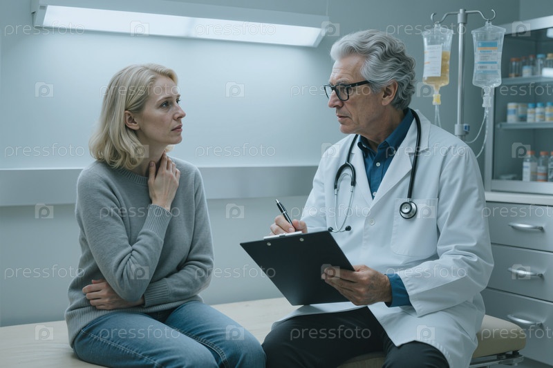 Старший врач консультирует взрослую женщину о симптомах боли в горле