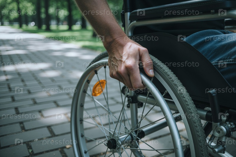 Мужчина-взрослый с ограниченными возможностями передвигается в инвалидной коляске на открытом воздухе для обеспечения доступности