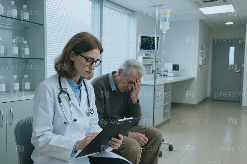 Женщина-врач рассматривает график рядом со старшим мужчиной в больнице