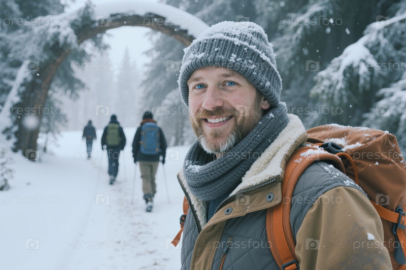 Портрет взрослого мужчины, путешествующего по тропе в снежном лесу для зимней поездки