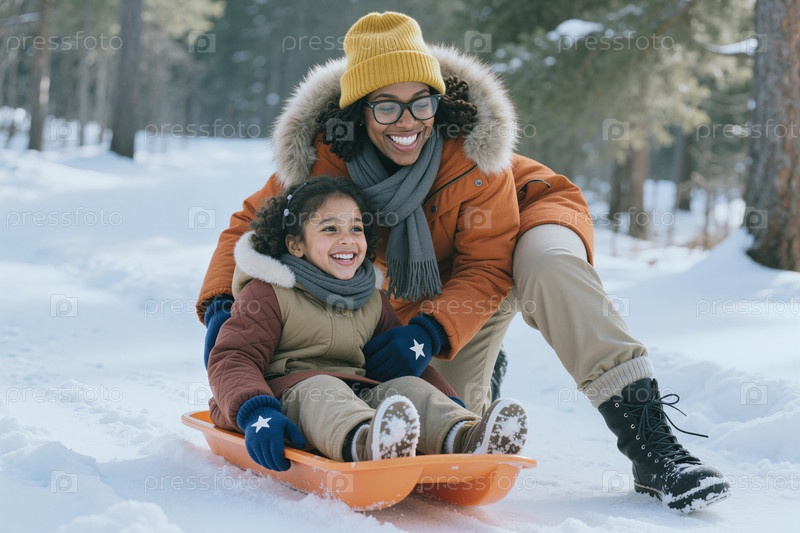 Черная мать и ребенок катаются на коньках в снегу для зимнего семейного досуга