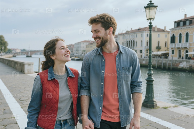 Взрослая пара гуляет вдоль канала во время романтического городского отдыха