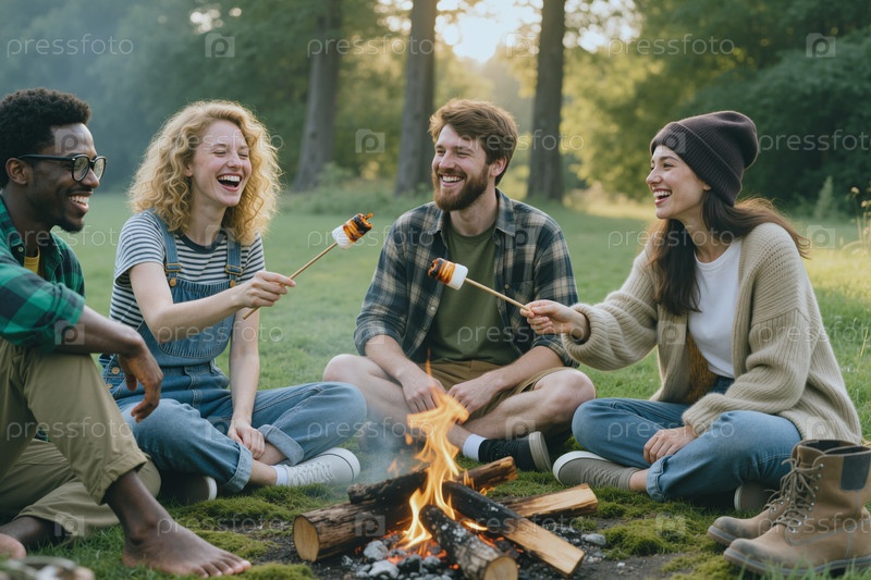 Разнообразные взрослые друзья жарят зефиры на костре в парке