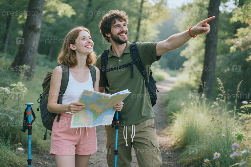 Взрослые пары ходят с картой и указывают на лесную тропу