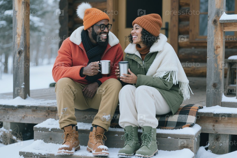 Черный мужчина и женщина пьют кофе во время зимнего отъезда из хижины
