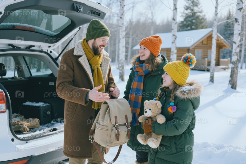 Семья, прибывающая в зимнюю хижину для отдыха на каникулах