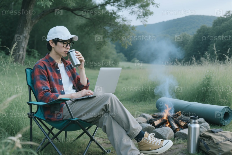 Азиатский мужчина работает удаленно во время кемпинга с ноутбуком и кофе