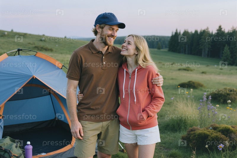 Взрослая пара обнимается во время кемпинга для летнего продвижения путешествий