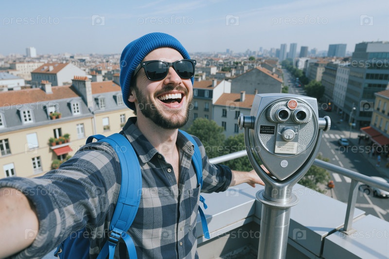 Портрет взрослого мужчины, делающего селфи на городской смотровой площадке во время путешествия