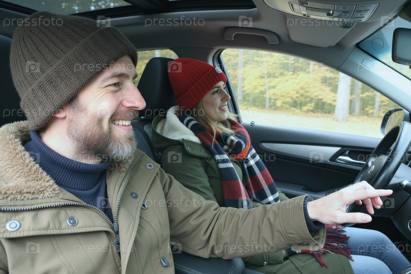 Взрослая пара управляет автомобилем на осенней дорожной поездке для отдыха в путешествиях